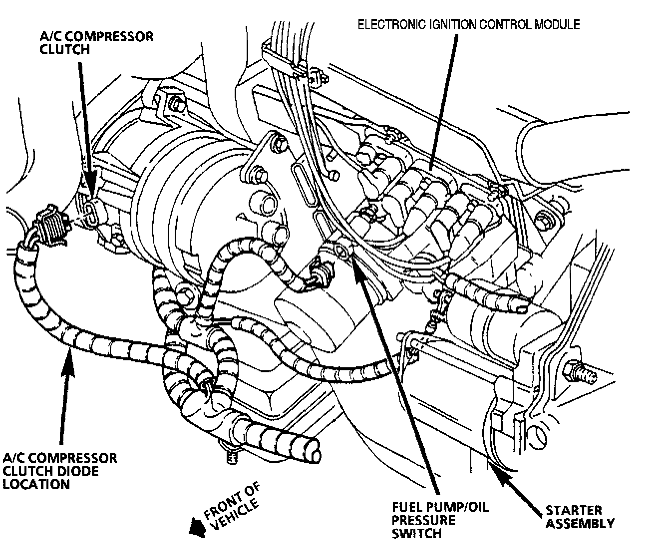 The Electronic Ignition Control Module is located on the right hand front of engine, below exhaust manifold inside the ignition coil assembly.