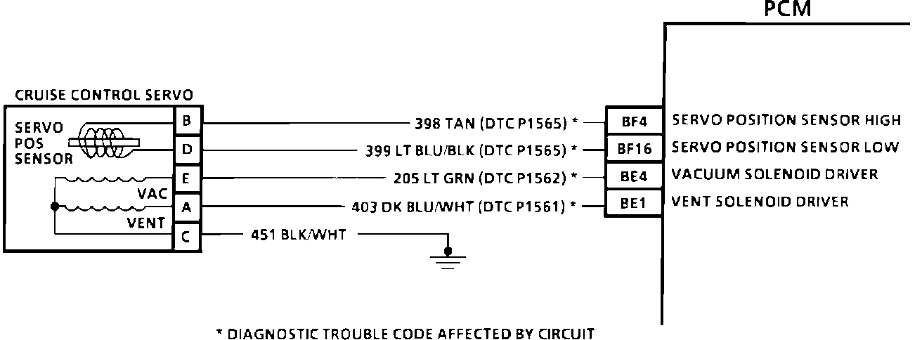 The PCM applies 5 volts to the Servo Position Sensor (SPS) and receives a returned frequency from the servo. Depending on the actual servo position, the AC frequency will vary indicating the position of the servo blade. The PCM uses this information to control the servo position when cruise is engaged.