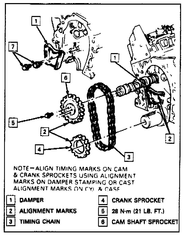 ^ Align timing marks on cam and crank sprockets using alignment marks on dampener stamping or cast alignment marks on cylinder and case.