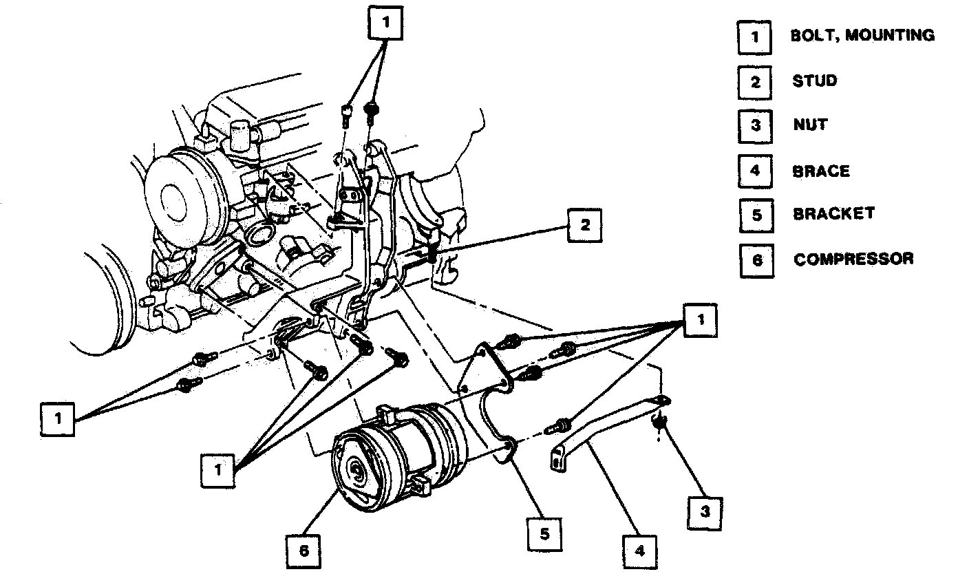 1. Rear A/C compressor mounting brace with bolts and A/C compressor.