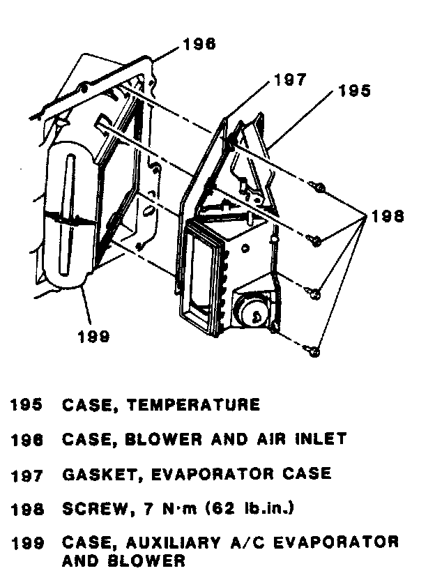 10. Four screws (189) retaifling auxiliary A/C evaporator and blower case (199) to blower and aii inlet case (196).