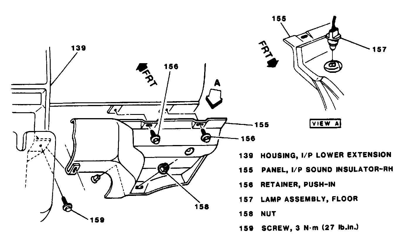11. RH I/P sound insulator panel screw, nut and push-in retainers. Tighten attaching screw to 3 Nm (27 lb in).