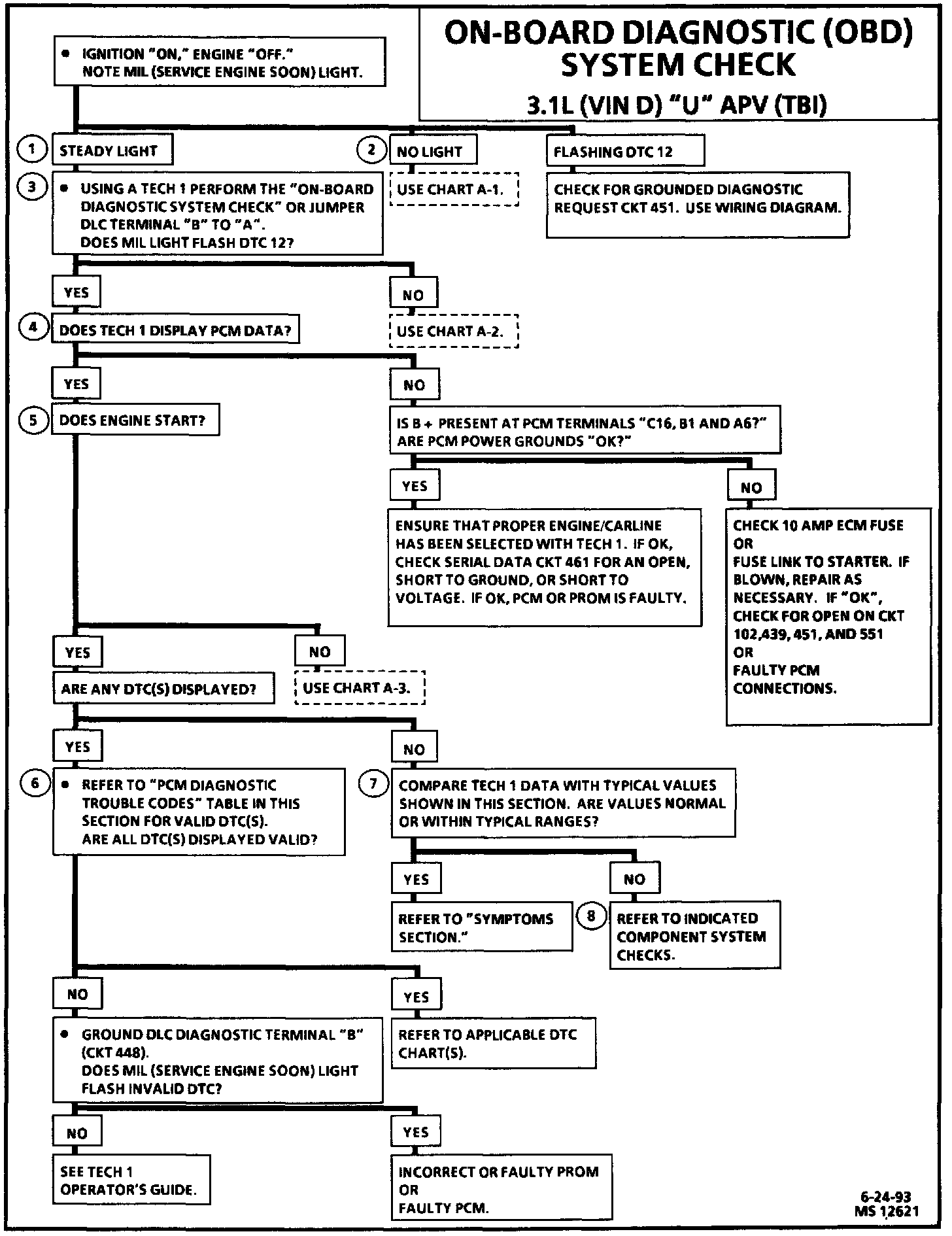 4. Most of the diagnostic charts use a Tech 1 scan tool to aid diagnosis, therefore, serial data must be available. If a PROM error is present, the PCM may have been able to flash DTC 12 or 51, but not transmit serial data.