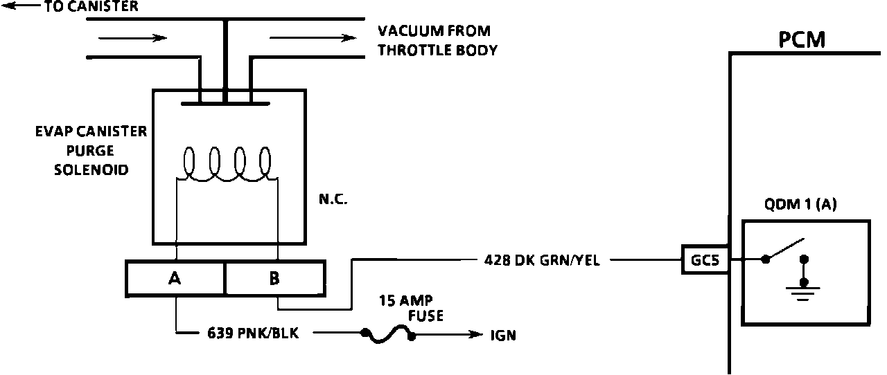 The canister purge is controlled by a solenoid that allows vacuum to purge the fuel vapor canister when energized. The PCM controls the ground to power the solenoid. If the diagnostic test terminal is grounded with the engine not running, or the following exist with the engine running, the purge solenoid is energized: