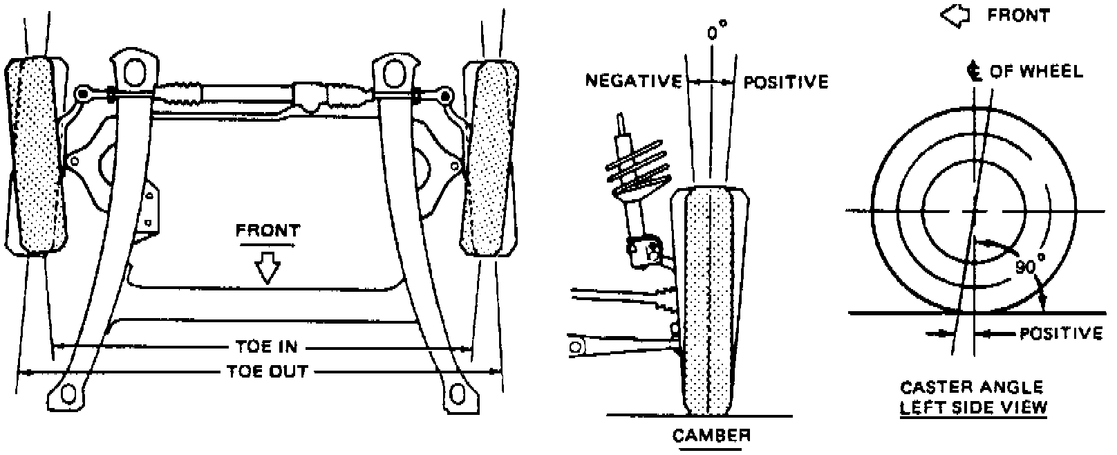 Toe, Fig.1 , is controlled by tie rod position. Adjustment is made by loosening the clamp bolts at the steering knuckle end of the tie rods and rotating the rods to obtain proper toe setting, Fig.3 . After correct toe setting is obtained, torque clamp bolts to 41 ft. lbs.