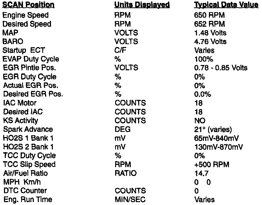 The Tech 1 scan data listed in this table may be used for comparison after completing the On-Board Diagnostic System Check and finding the on-board diagnostics functioning properly with no diagnostic codes displayed. The "Typical Tech 1 Data Values" are an average of display values recorded from normally operating vehicles and are intended to represent what a normally functioning system would display. The values you get may vary due to low battery charge or other reasons, but they should be very close.NOTE: A SCAN TOOL THAT DISPLAYS FAULTY DATA SHOULD NOT BE USED, AND THE PROBLEM SHOULD BE REPORTED TO THE MANUFACTURER. THE USE OF A FAULTY SCAN TOOL CAN RESULT IN MISDIAGNOSIS AND UNNECESSARY PARTS REPLACEMENT.