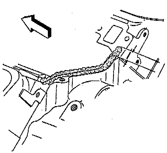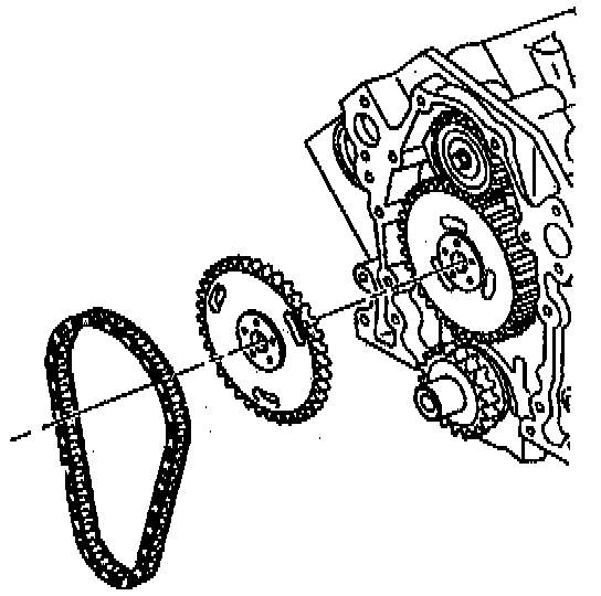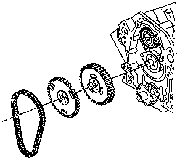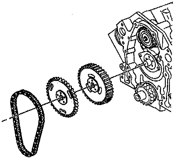 c. Install the camshaft sprocket and timing chain. The gears must mesh in order to prevent damage to the camshaft retainer.