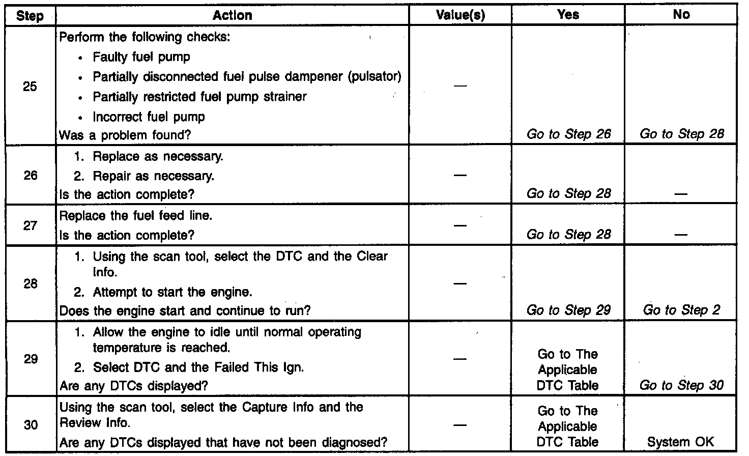 ^ A regulated pressure but less than 415 kPa (60 psi). Amount of fuel to injector OK, but pressure is too low. System will run lean and may set a DTC. Also, hard starting cold and overall poor performance or may not start at all. Refer to Engine Cranks but Does Not Run. Engine Cranks, But Will Not Run
