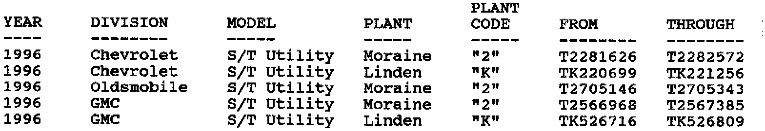 Involved are certain 1996 S/T 4-door Utility model vehicles built within the VIN breakpoints as shown.