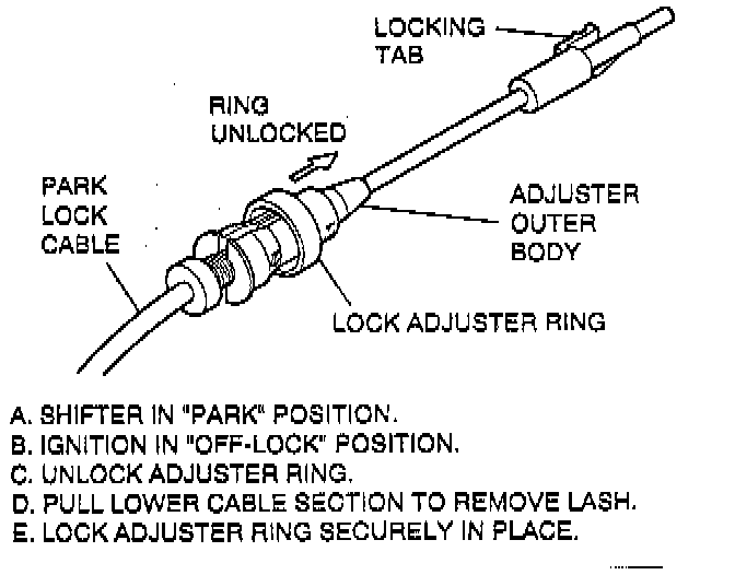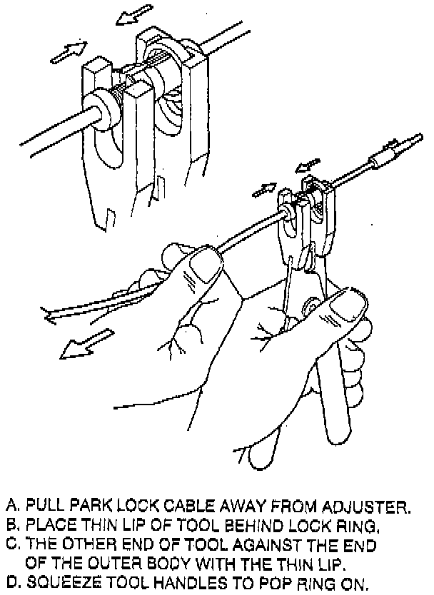 d. Pull on cable until park lock latch contacts gear shift lever.