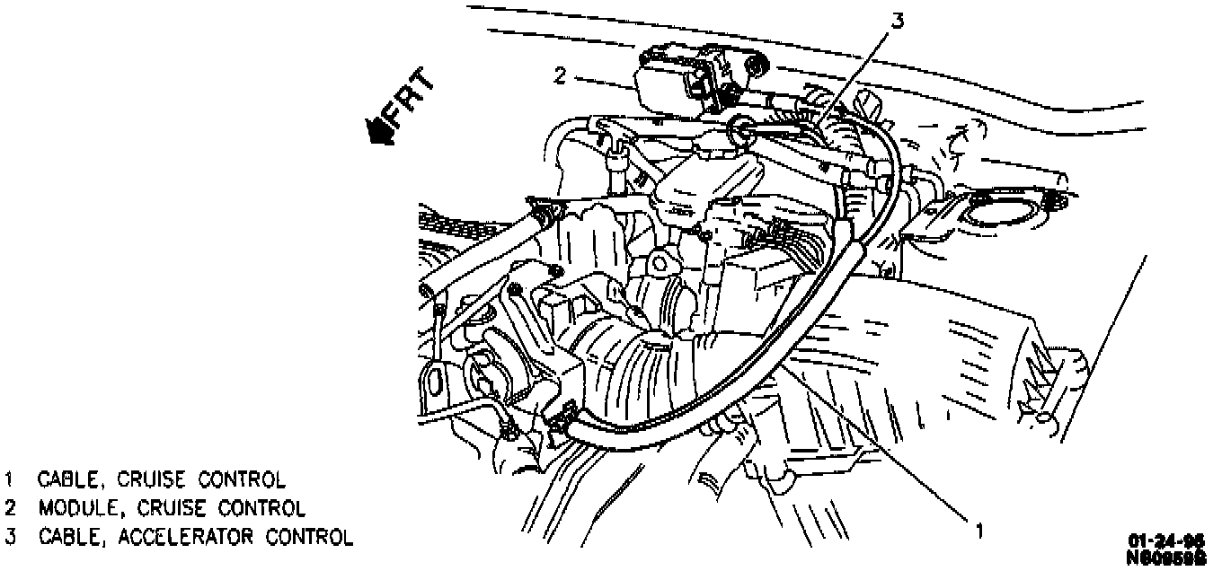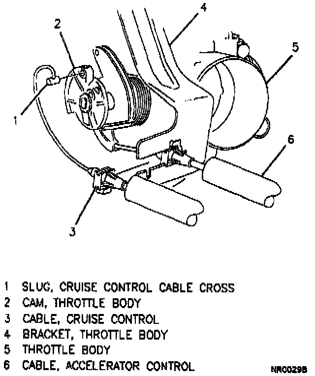 1. Cruise control cable tab from TBI cam. Rotate throttle body cam to 1/4 open throttle to release tab.