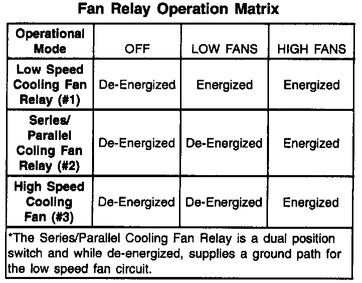 The PCM will command fan operation when: Low Speed Fan Operation