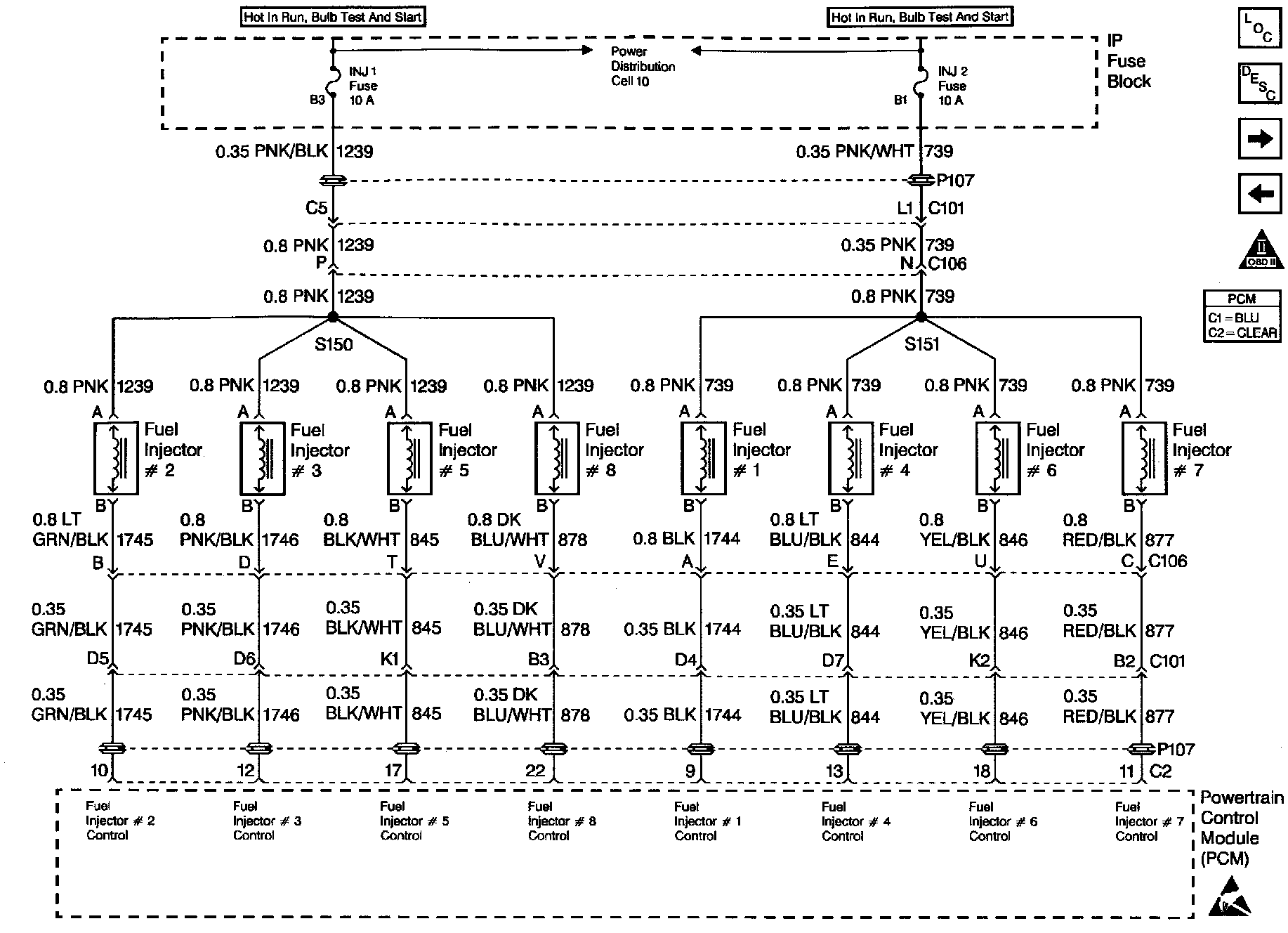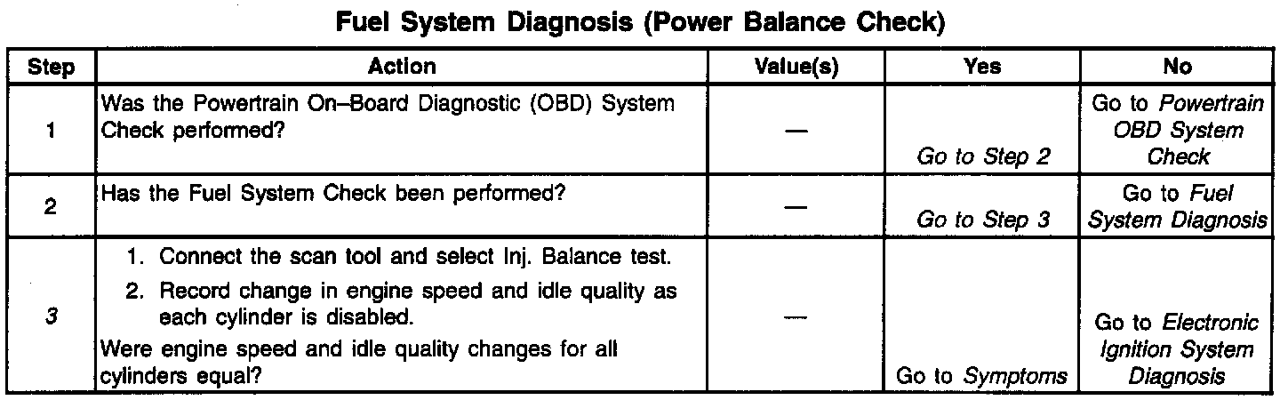 Refer to Injectors 1-4-6-7 wiring view and Injectors 2-3-5-8 wiring view for an electrical diagram of this circuit. The Power Balance Check compares the performance of each of the cylinder by using the PCM to shut off fuel injection. This measures the performance of each cylinder by the amount of RPM drop caused by that cylinder not producing a power stroke. If proper fuel delivery has been determined, then a cylinder that does not show good performance (RPM drop) indicates either an ignition or mechanical problem.