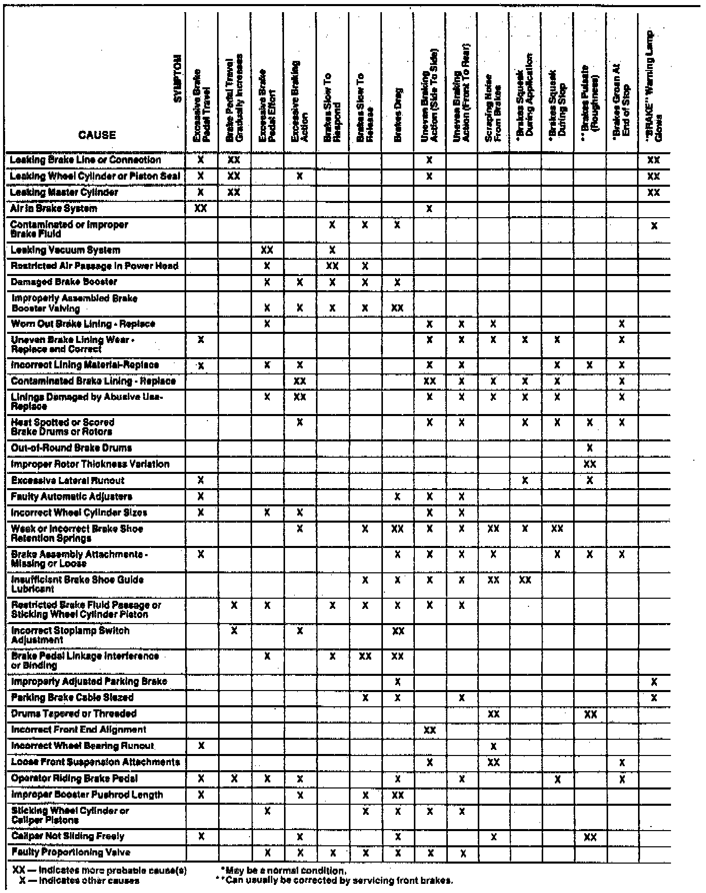 When road testing the vehicle, be aware of other vehicle systems and conditions which might affect the brake system or generate brake complaints. Be particularly aware of conditions which might cause leading or pulling to one side when the brakes are not applied. Conditions which might cause such, or which might be mistaken for brake problems include: