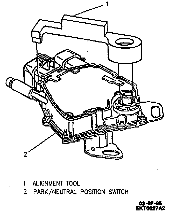 ^ When installing park/neutral position switch with a sheared pin, insert the alignment tool into the two slots on the switch in the area of the transaxle shaft. Rotate the tool until the rear leg on the tool falls into the slot on the switch near the hose. Verify tool is properly seated in all three slots. Remove tool.