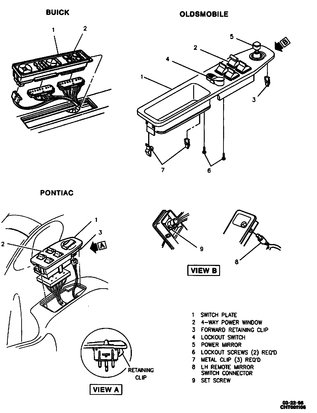 4. Switch plate by inserting small flat-bladed tool between trim panel at either forward or rearward edge to disengage retainer clips fro trim panel (Oldsmobile).