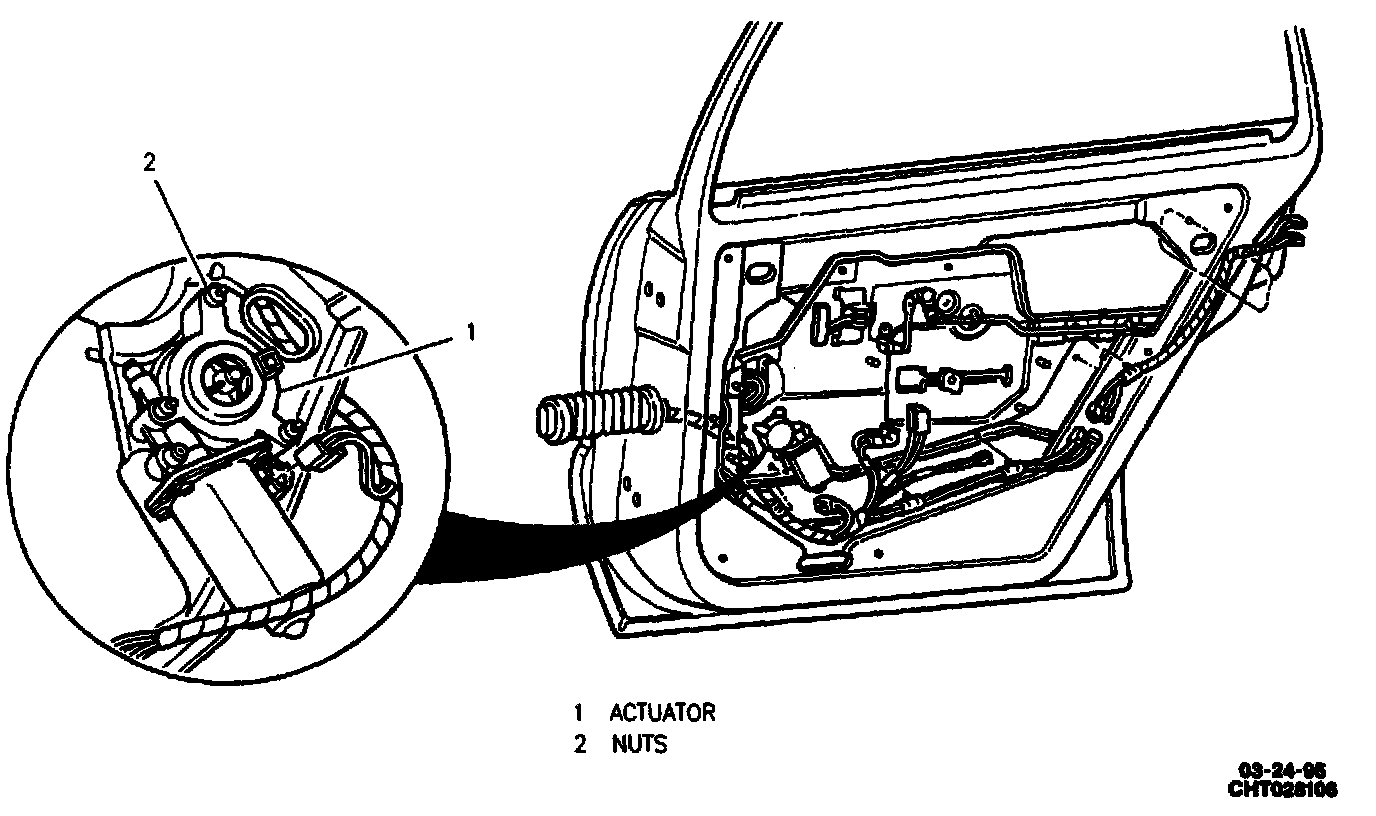 CAUTION: If door module assembly is removed from vehicle, relieve tension on actuator spring using tool J 38864 or equivalent. Failure to relieve tension on actuator spring could cause the cross arm assembly to suddenly spring closed when removing power window actuator, resulting in personal injury.
