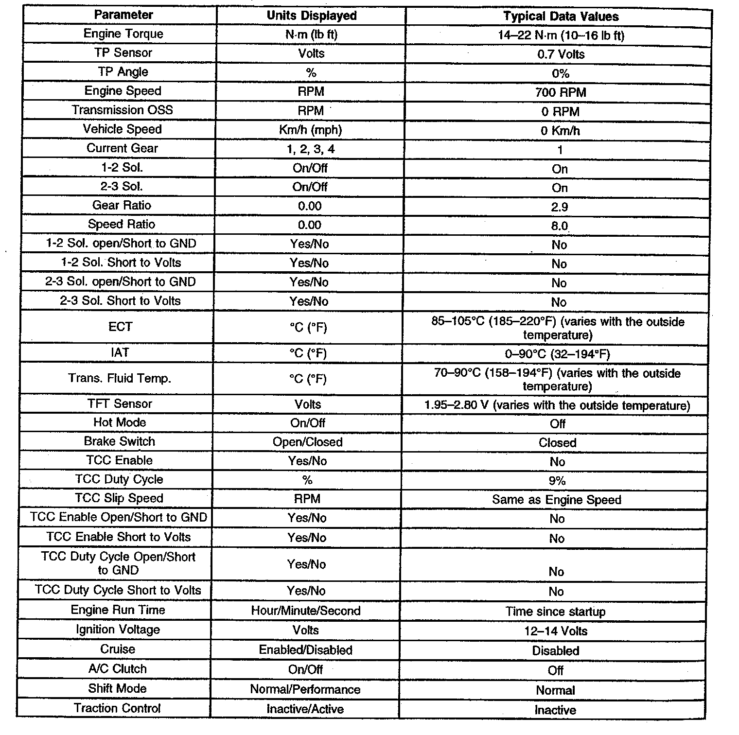 If you have completed the On-Board Diagnostic (OBD) system check, if the diagnostics are functioning properly and if no DTCs display, you may use the values in the table below for comparison within the appropriate transmission. These typical values are an average of display values recorded from normally operating vehicles. They represent the display from a normally functioning system.