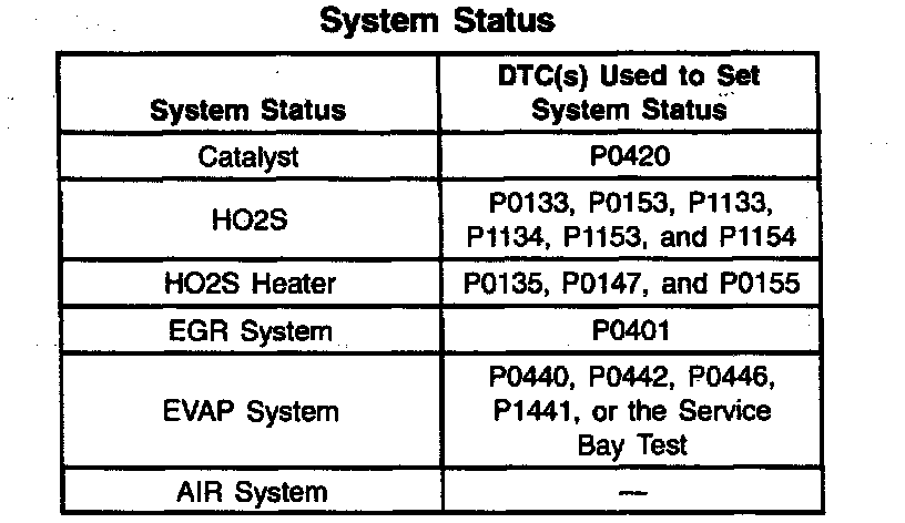 IMPORTANT: The System Status display indicates only if the PCM has completed the required tests (DTCs). The System Status display does not necessarily mean that the test has passed. If a failure indication is present for a DTC associated with one of the above systems, that test has failed. Diagnosis and repair are necessary in order to meet the I/M requirement. Verify that the vehicle passes all of the diagnostic tests associated with the displayed System Status prior to returning the vehicle to the customer.