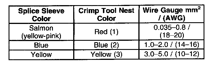 4. Select the proper sealed splice sleeve according to the wire size. Refer to the above table at the beginning of the repair procedure for the color coding of the splice sleeves and the crimp tool nests.