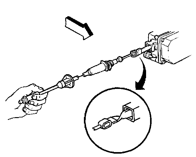8. Connect the cruise control cable conduit fitting to the round hole in the engine cable bracket. Ensure that the tabs snap securely into the hole.