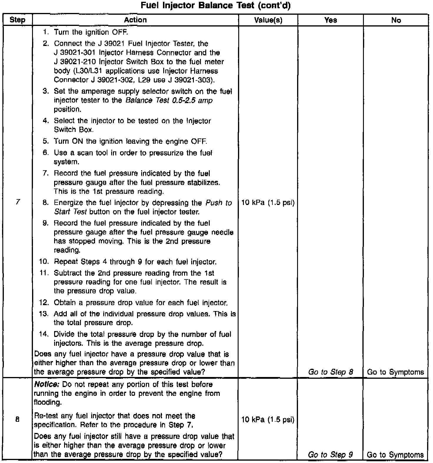 The Fuel Injector Tester J 39021, the Injector Switch Box J 39021-210 and the Injector Harness Connector d 39021-301 energize the injector for a precise amount of time allowing a measured amount of fuel into the manifold. This causes a drop in system fuel pressure that can be recorded and used to compare each injector. All injectors should be within the same pressure drop range, the average pressure drop value for all injectors is ±10 kPa (1.5 psi).