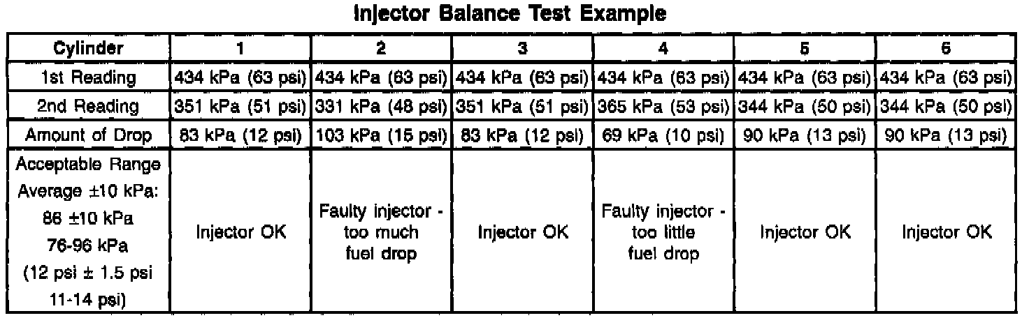 7. If the pressure drop value for each fuel injector is within 10 kPa (1.5 psi) of the average pressure drop value, the fuel injectors are flowing properly. Calculate the pressure drop value for each fuel injector by subtracting the second pressure reading from the first pressure reading. Refer to the illustration above.