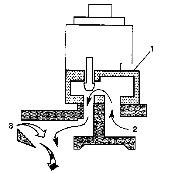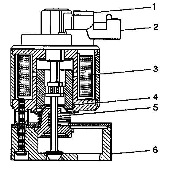 A 12 volt current which enters the valve through an electrical connector (terminal E) energizes the solenoid (bobbin and coil) assembly (3). The 12 volt current then flows through the solenoid assembly to the control module and creates an electromagnetic field. This field causes the armature assembly (4,6) to be pulled upward, lifting the pintle (5) a variable amount off the base.