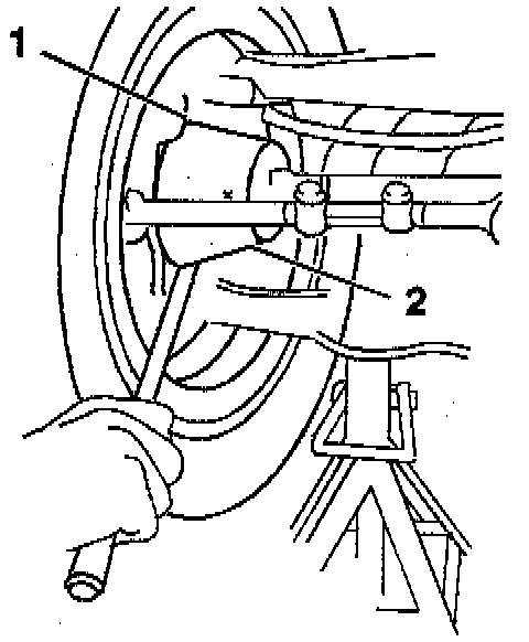 7. Pry between the lower control arm (2) and the outer bearing race (1) while reading the dial indicator. This shows vertical looseness in the ball joints. The lower ball joint is not preloaded and may show some looseness.