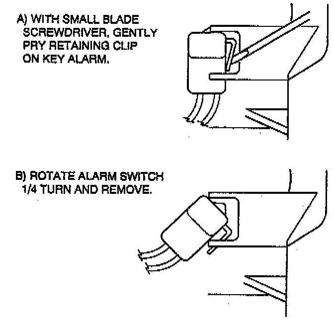 ^ Gently pry retaining clip on alarm switch with small blade screwdriver.