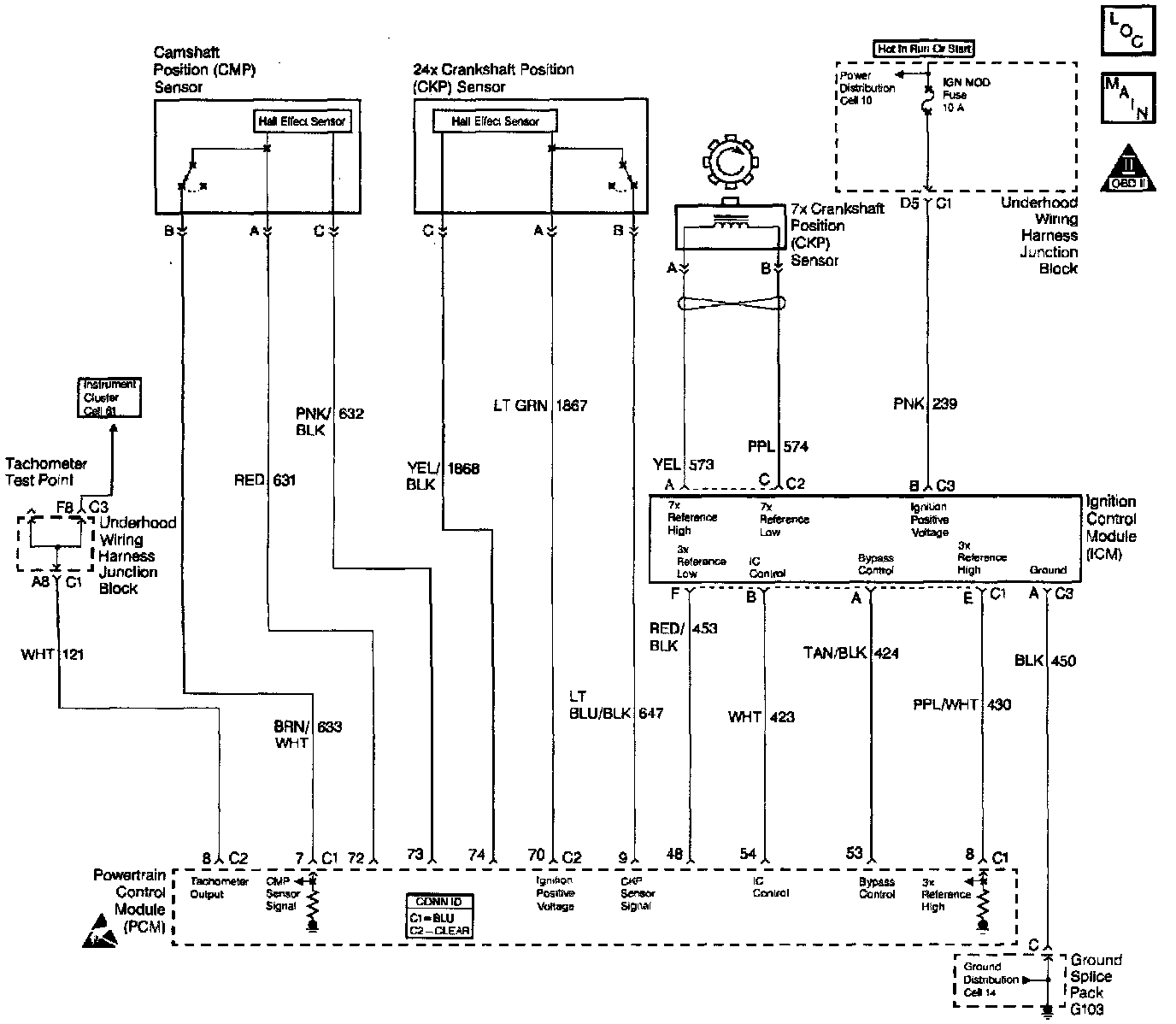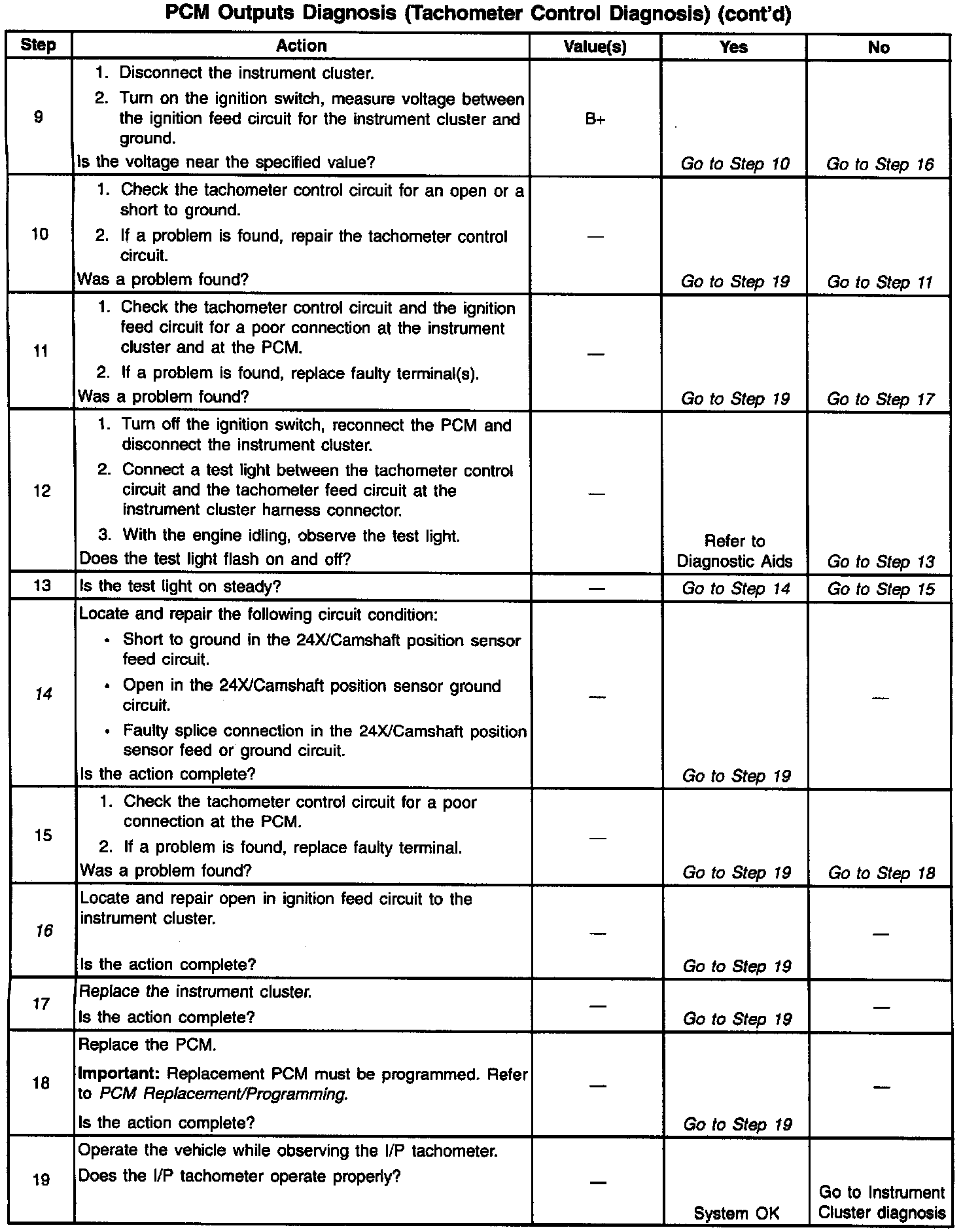 14. A fault in the 24X/Camshaft position sensors feed or ground circuits will result in the loss of both PCM input pulses. Without a 24X reference pulse the PCM can not begin tachometer pulse control causing an inoperative tachometer.