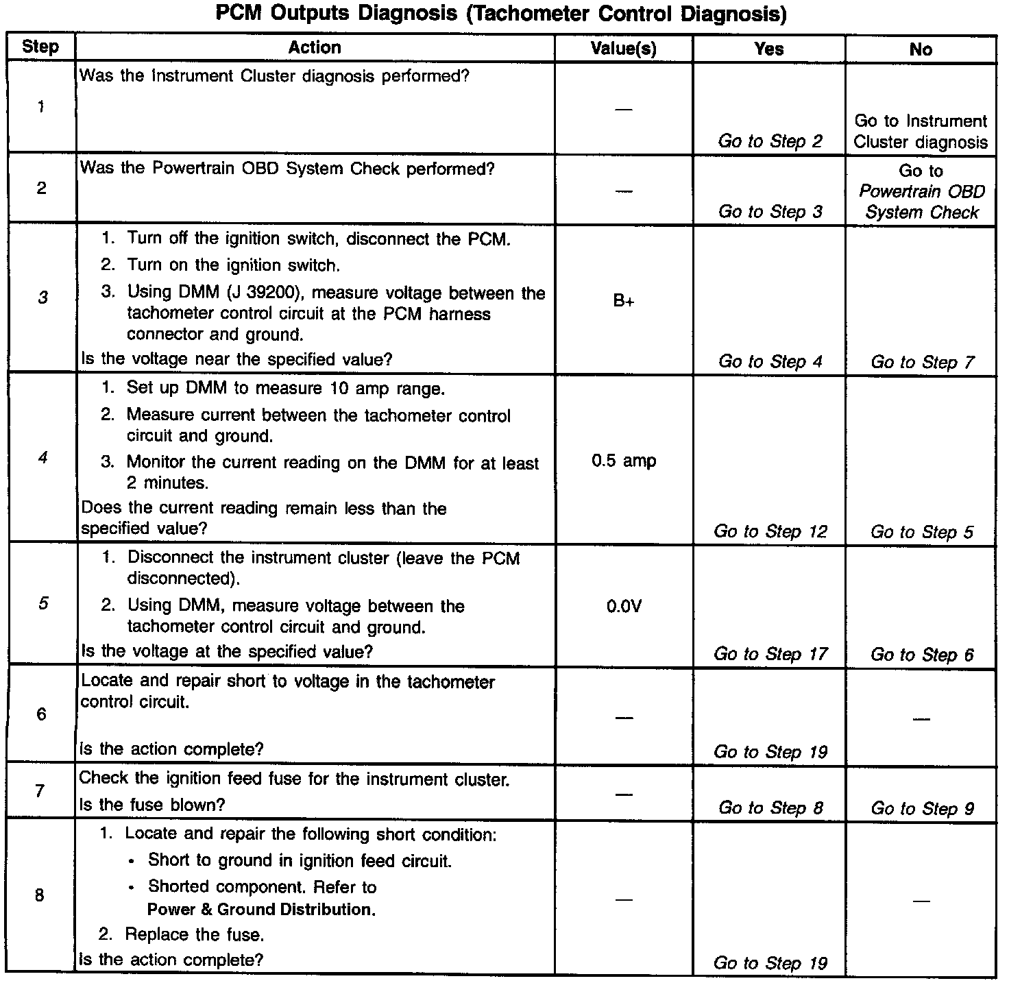 ^ Damaged harness. Inspect the wiring harness for damage. If the harness appears to be OK, disconnect the PCM, turn the ignition ON and observe voltmeter connected to the tachometer control circuit at the PCM harness connector while moving connectors and wiring harnesses related to the tachometer control circuit. A change in voltage will indicate the location of the fault.