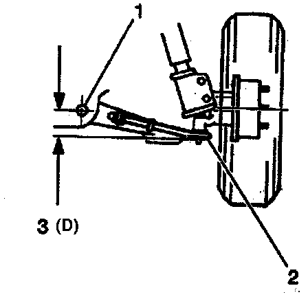 Measure the clearance (3) between the centerline of the rear bolt bushing (1) and the lowest point on the ball joint housing (2) (except the grease fitting) to obtain the D (3) specification.
