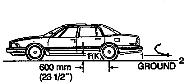 Measure the clearance (1) between the rear underbody and the ground (2) to obtain the K dimension.