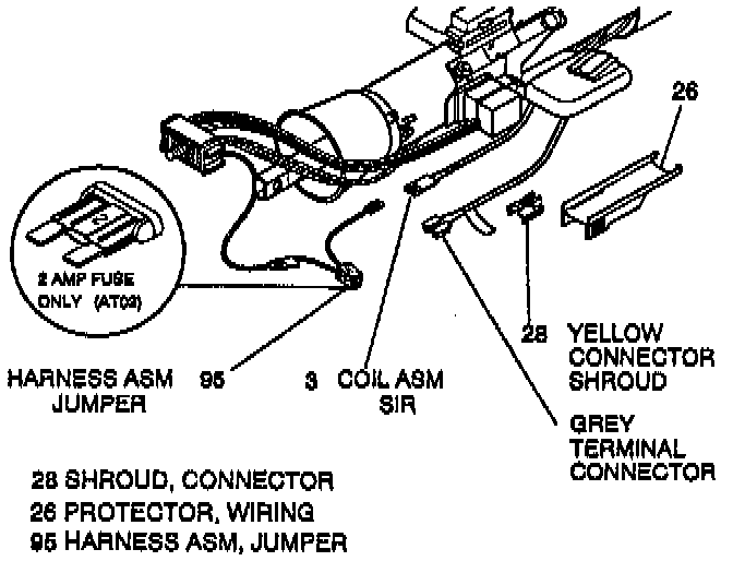 3. Connector Position Assurance (CPA) and yellow 2-way Supplemental Inflatable Restraint (SIR) harness connector located near the base of the steering column.