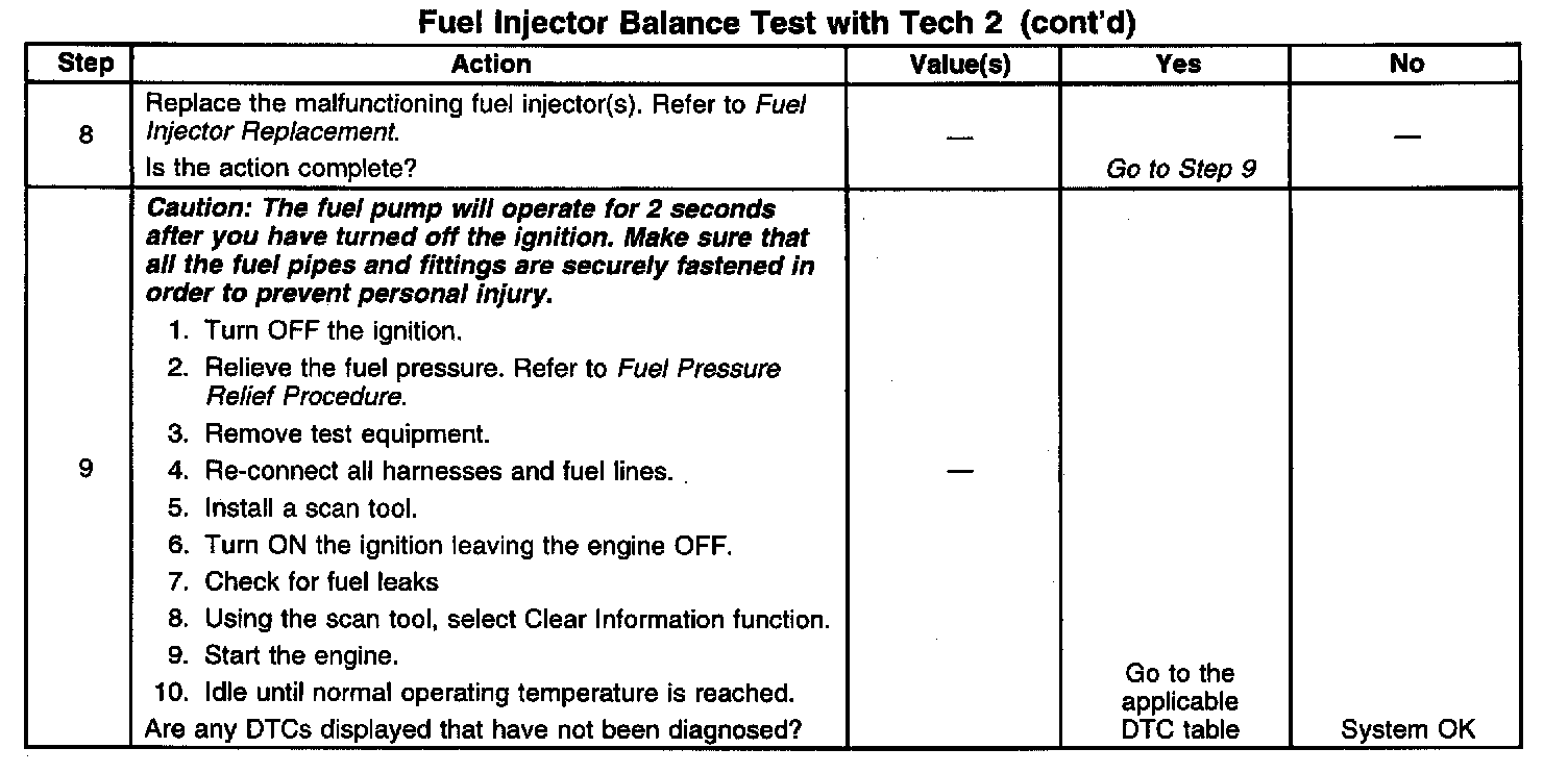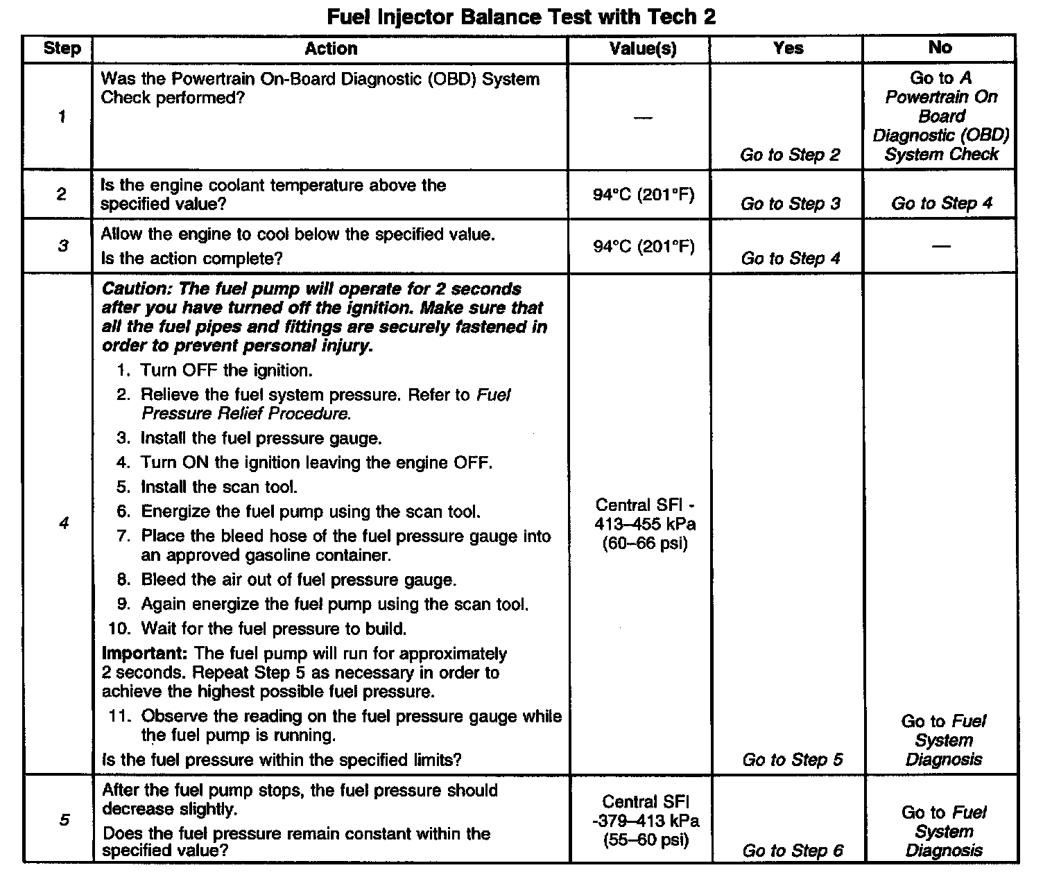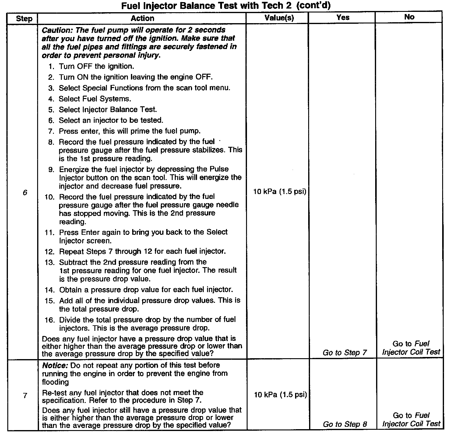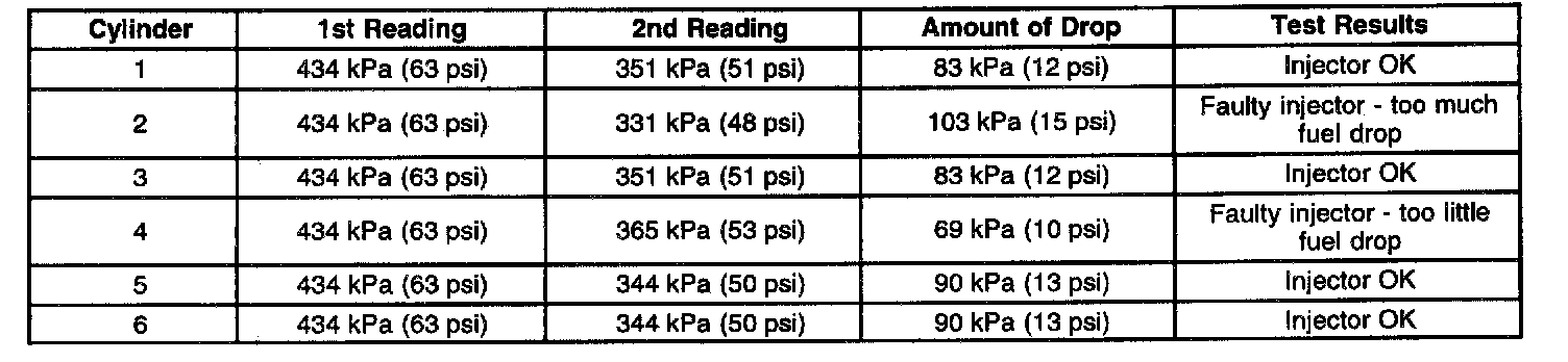 Test Results: Combine all of the injector pressure drops and divide this number by the amount of injectors available. This is the average pressure drop. Each individual injectors pressure drop value must be within 10 kPa (1.5 psi) of the average pressure drop value.