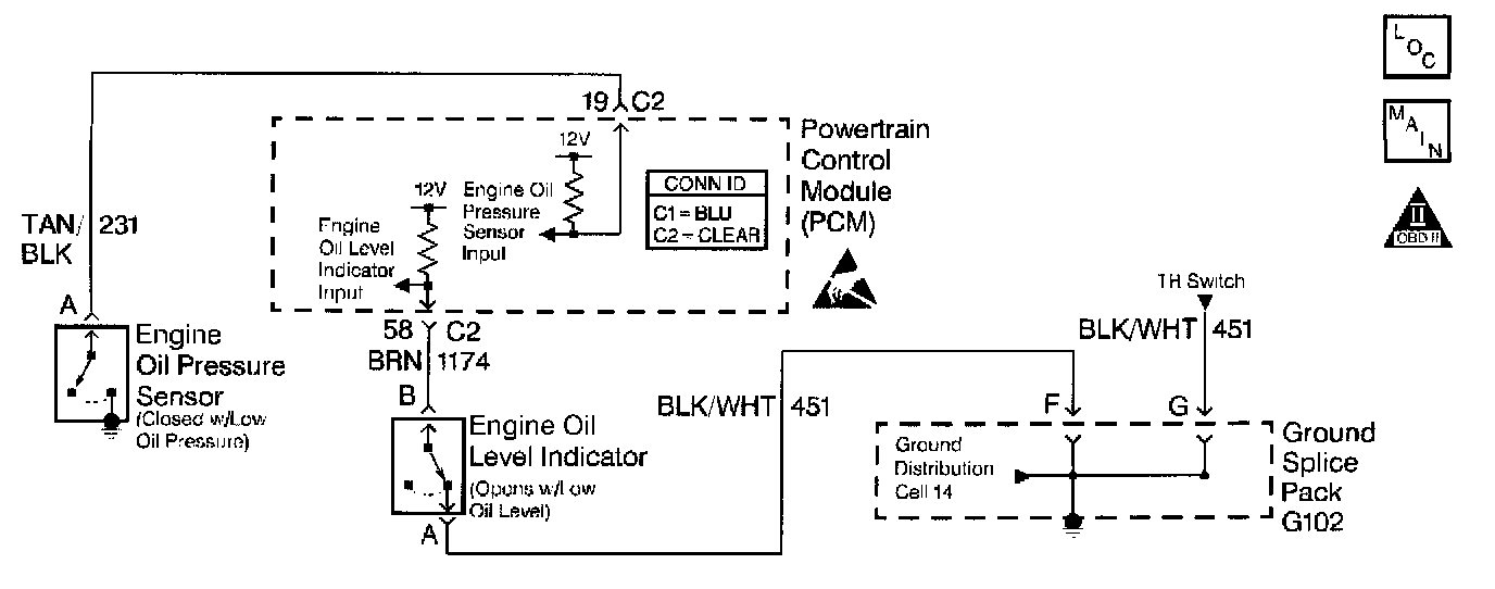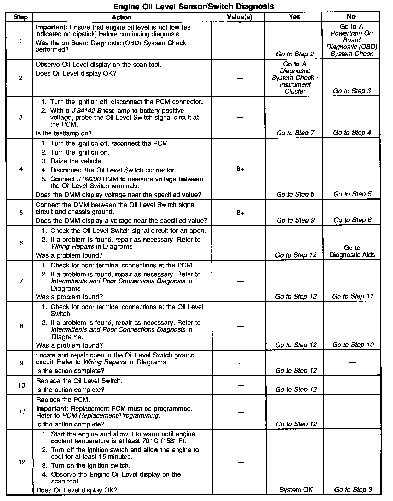 ^ Poor connection at PCM or oil level sensor. Inspect harness connectors for backed out terminals, improper mating, broken locks, improperly formed or damaged terminals, and poor terminal to wire connection. Refer to Intermittents and Poor Connections Diagnosis.