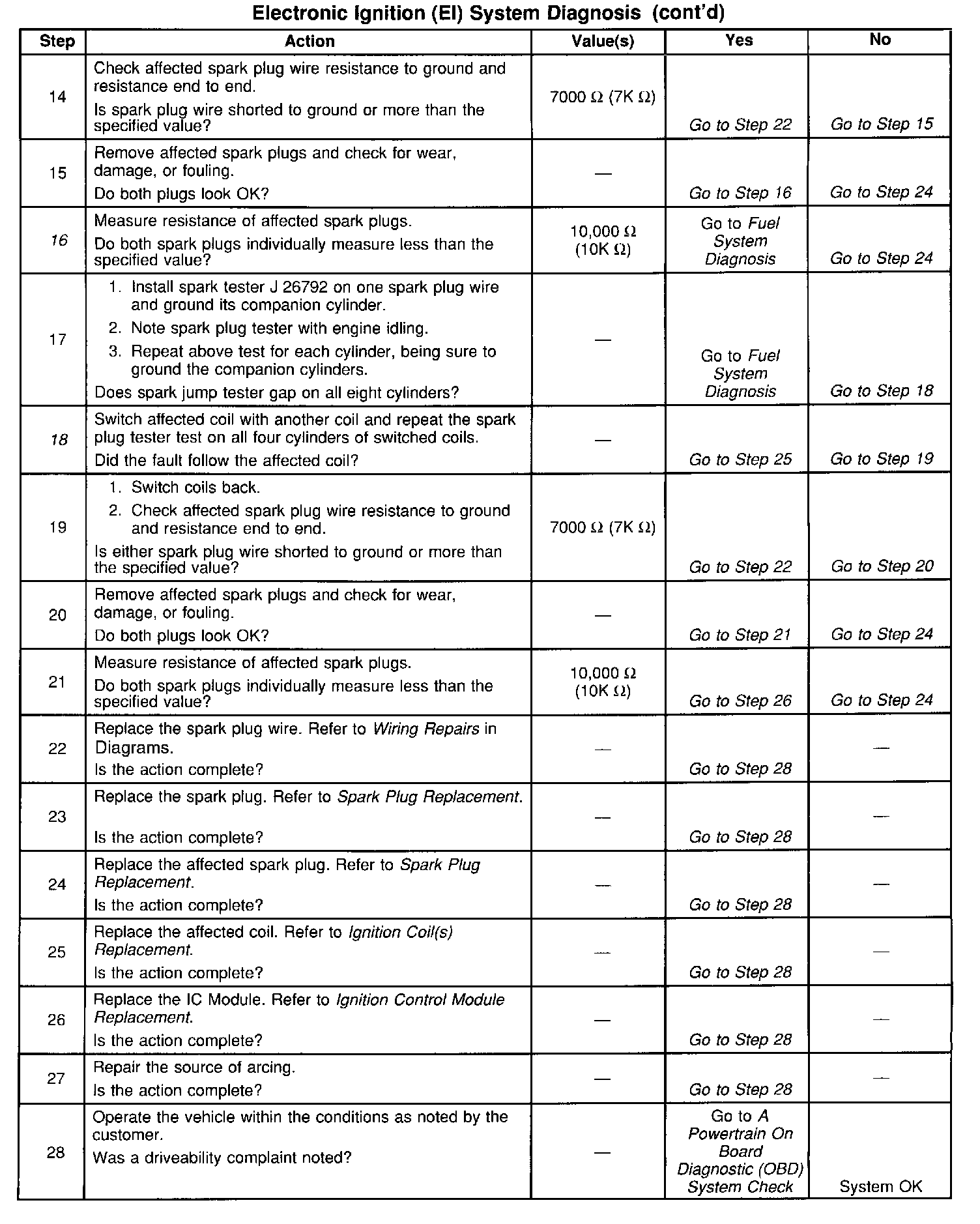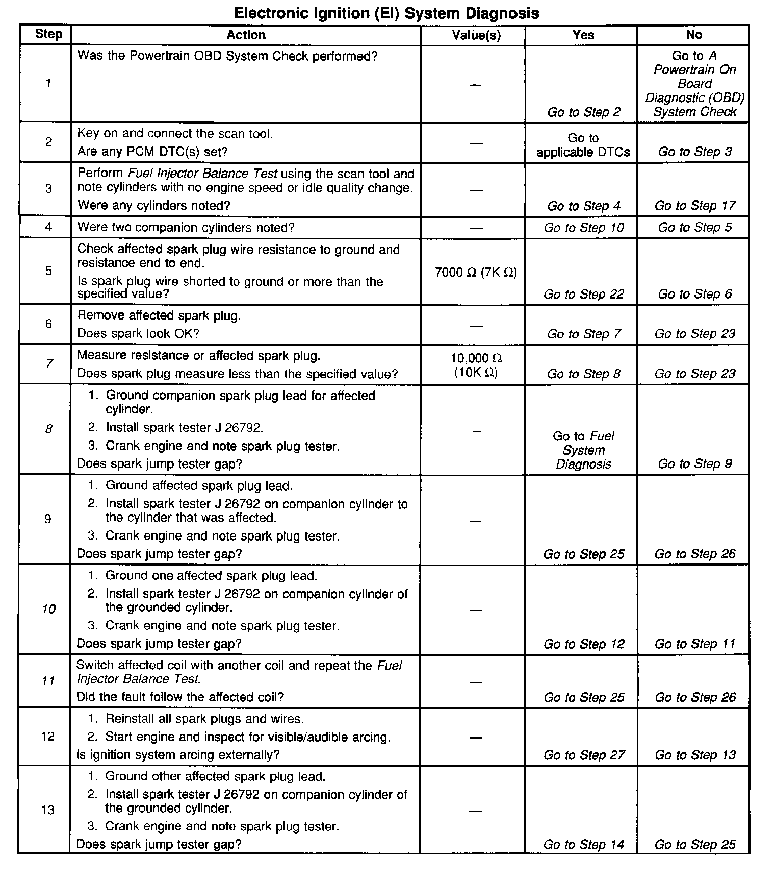 The Secondary Ignition Check tests for faulty spark plugs, plug wires, or IC Module/Coils. This table requires the J 26792 spark tester (ST 125).
