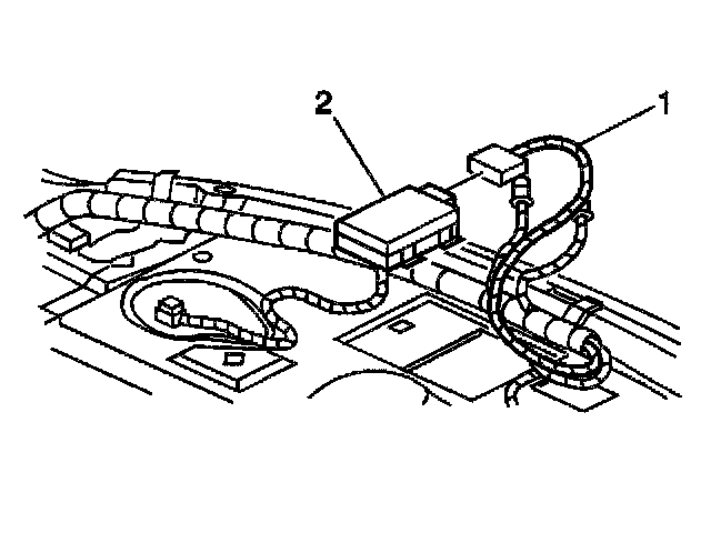 3. Remove the remote door lock receiver (2). The receiver (2) is located between the rear package shelf and the rear package shelf cover, just to the right of the center access hole. Compress the four tabs and slide the receiver (1) down through the access hole.