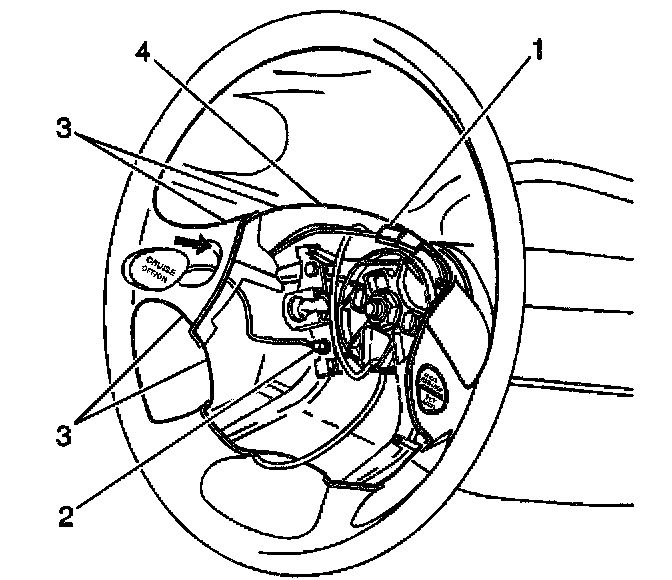 1. Push the steering wheel rear trim cover (4) up and forward in order to gain clearance to the switch wiring. Route the switch wiring between the back side of the steering wheel and the cover.