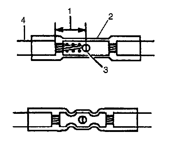 9. Insert the wires into the splice sleeve until the wire hits the barrel stop. The splice sleeve has a stop in the middle of the barrel in order to prevent the wire from passing through the splice (3).