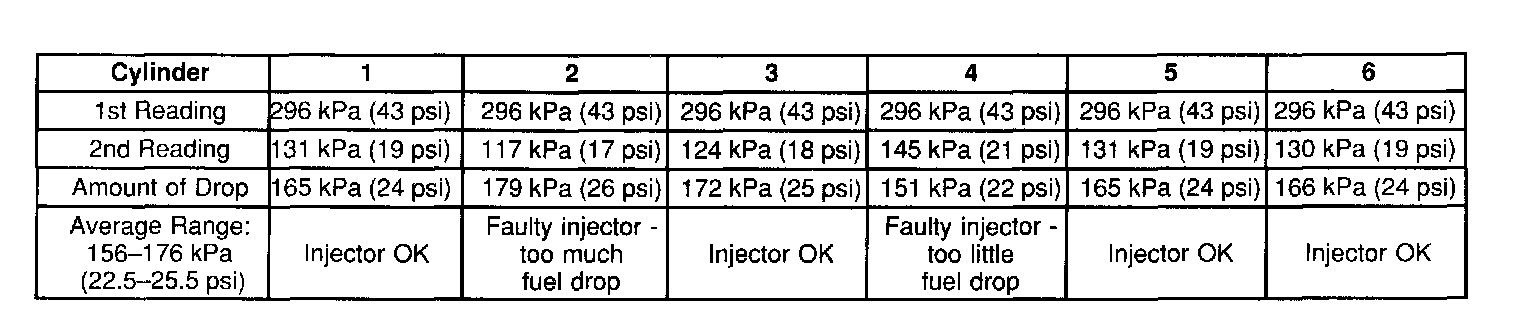 7. If the pressure drop value for each fuel injector is within 10 kPa (1.5 psi) of the average pressure drop value, the fuel injectors are flowing properly. Calculate the pressure drop value for each fuel injector by subtracting the second pressure reading from the first pressure reading. Refer to the Injector Balance Test Example.