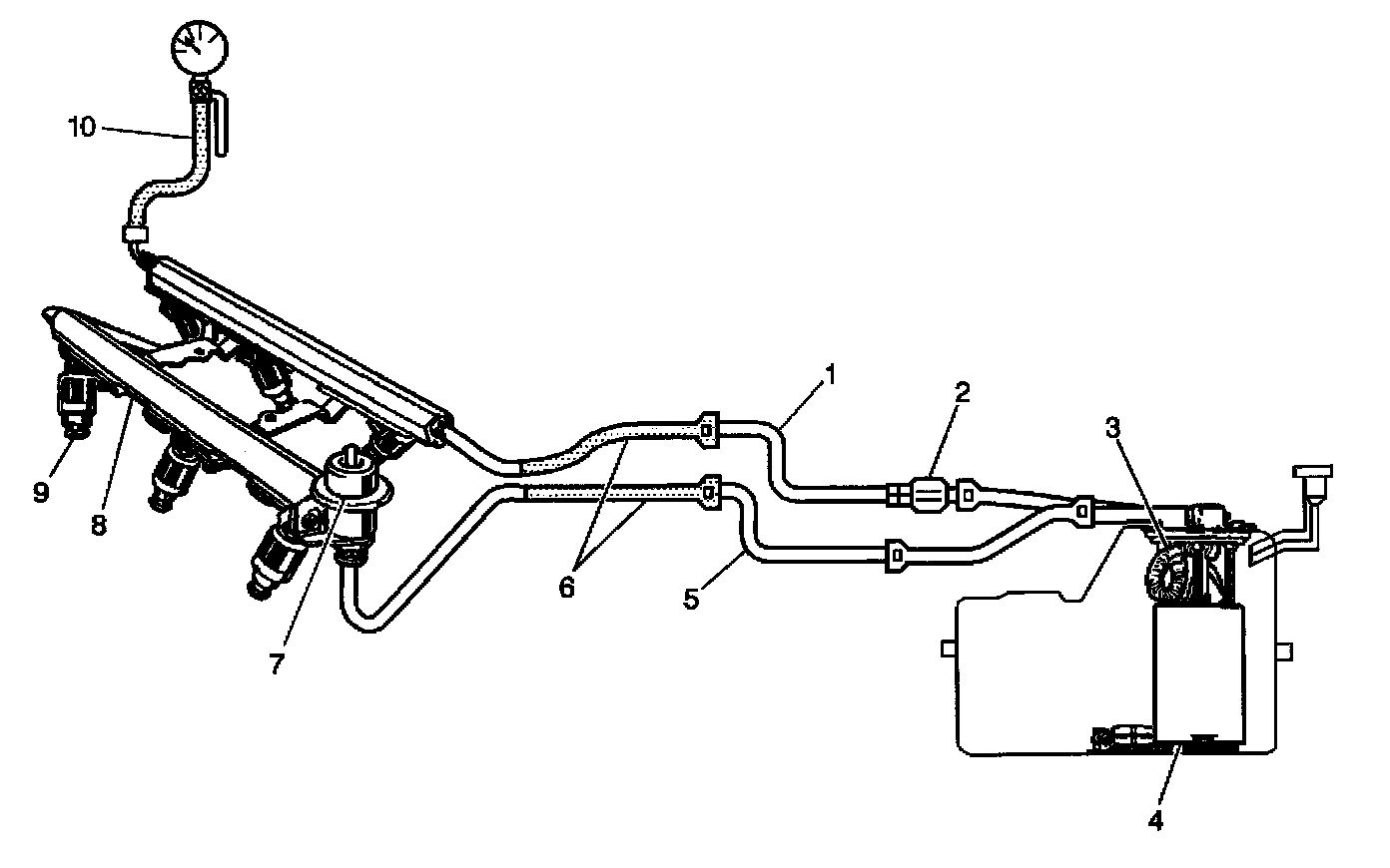 When the ignition switch is turned ON, the Powertrain Control Module (PCM) will turn ON the in-tank fuel pump. The in-tank fuel pump will remain ON as long as the engine is cranking or running and the PCM is receiving reference pulses. If there are no reference pulses, the PCM will turn the in-tank fuel pump OFF 2 seconds after the ignition switch is turned ON or 2 seconds after the engine stops running. The in-tank fuel pump is an electric pump within an integral reservoir (4). The in-tank fuel pump supplies fuel through the fuel feed pipe (1), and in-line fuel filter (2) to the Fuel Rail Assembly (8). The fuel pump is designed to provide fuel at a pressure above the pressure needed by the fuel injectors (9). A fuel pressure regulator (7), attached to the Fuel Rail, keeps the fuel available to the fuel injectors at a regulated pressure. Unused fuel is returned to the fuel tank by a separate fuel return pipe (5). The fuel pump flex pipe (3) functions as a conduit for transporting pressurized fuel from the fuel pump to the above cover fuel feed pipe. The fuel pump flex pipe also eliminates fuel pump generated pressure pulse noise, and eliminates clamps formerly needed for rubber hoses or nylon pipes. The fuel pressure gauge J 34730-1A (10). The fuel pipe return and feed hose assemblies are the pinch points used during the fuel system pressure test (6).