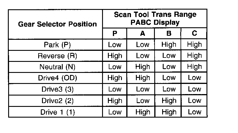 Transaxle Range Switch Valid Input Combinations: