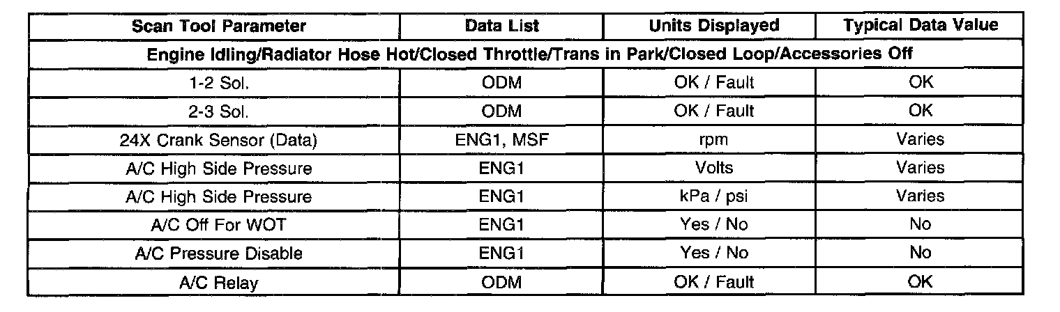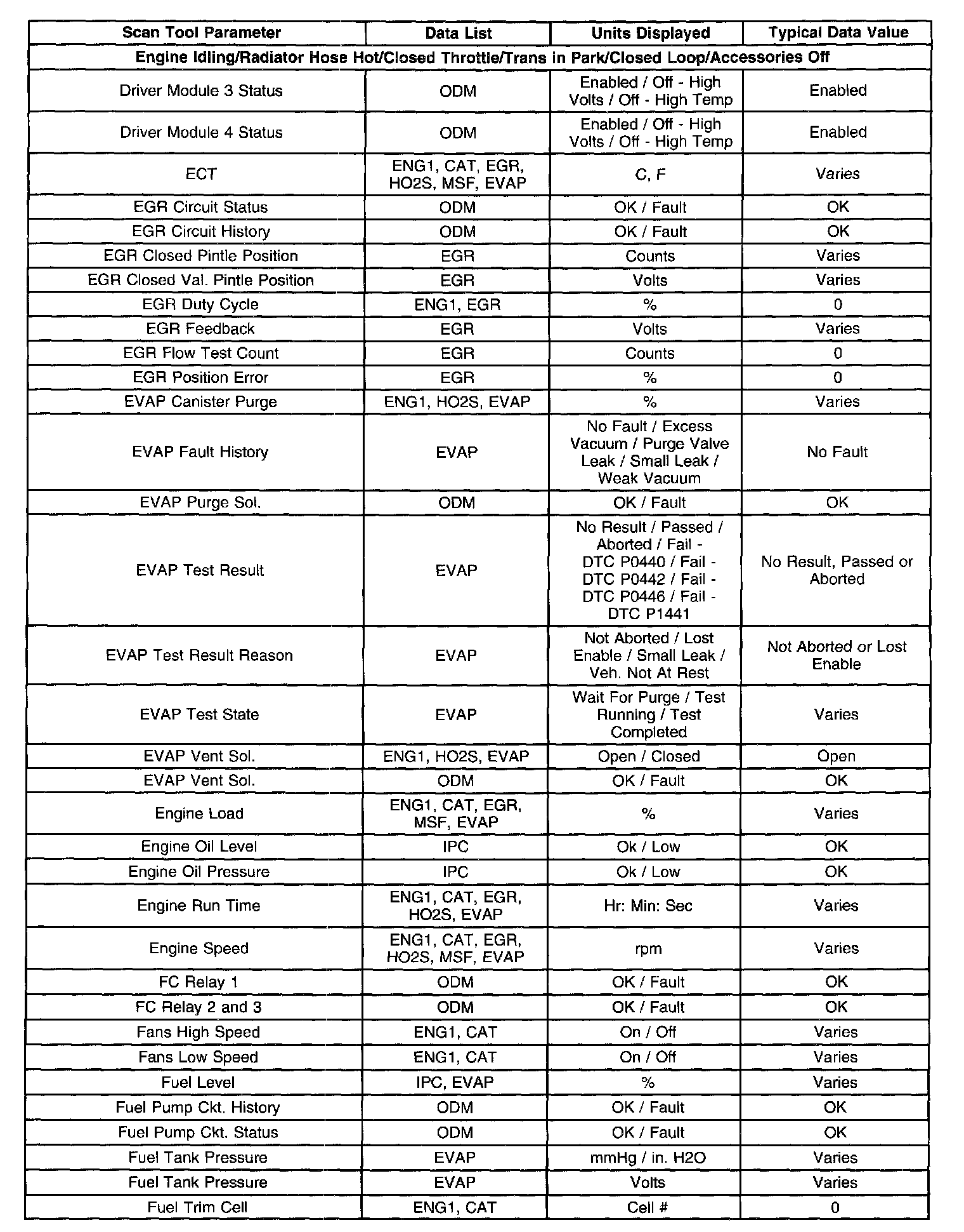 The Engine Scan Tool Data List contains all engine related parameters that are available on the scan tool. The list is arranged in alphabetical order. A given parameter may appear in any one of the data lists, and in some cases may appear more than once, or in more than one data list in order to group certain related parameters together.