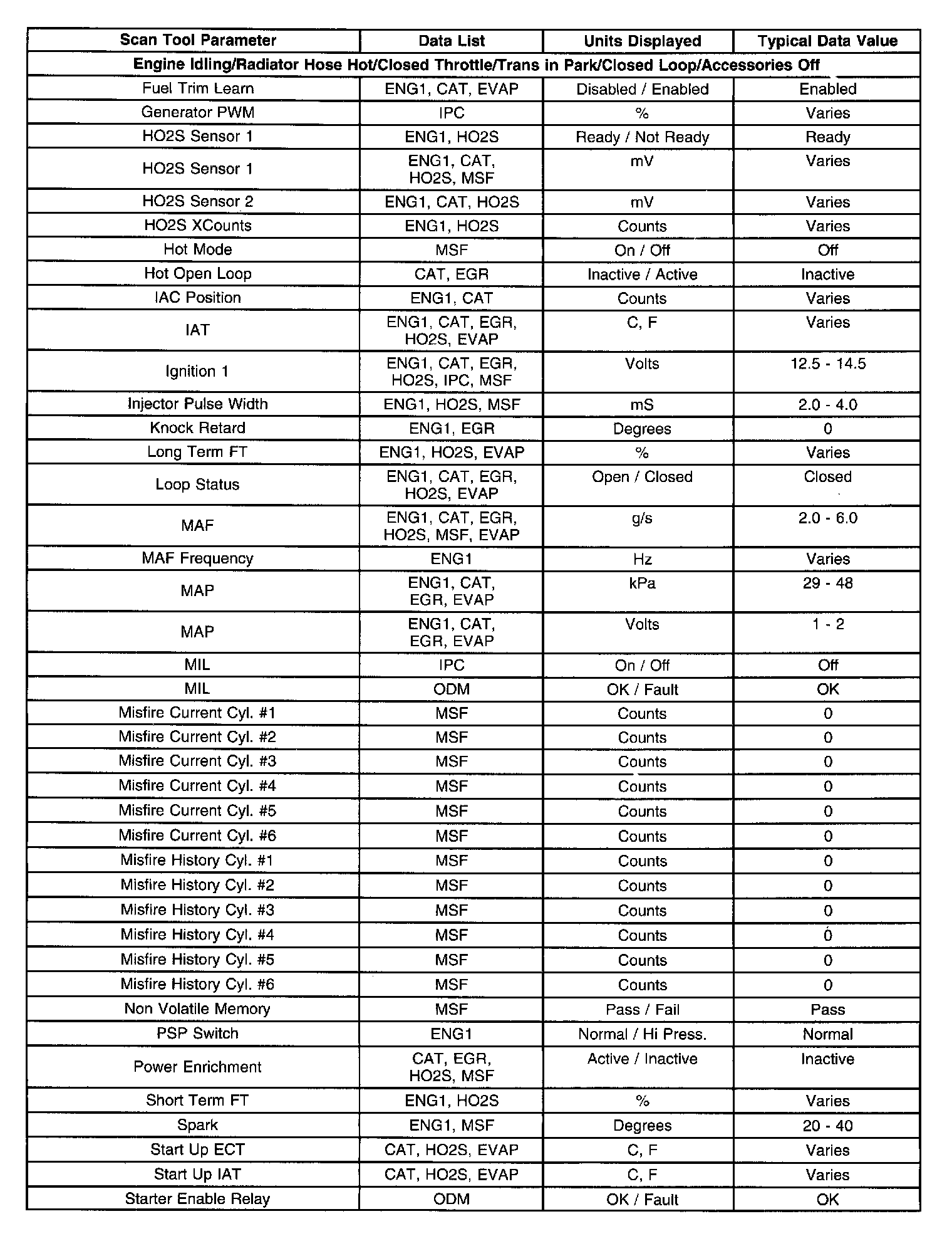 Scan tool values from a properly running engine may be used for comparison with the engine you are diagnosing. The Engine Scan Tool Data List represents values that would be seen on a normally running engine.