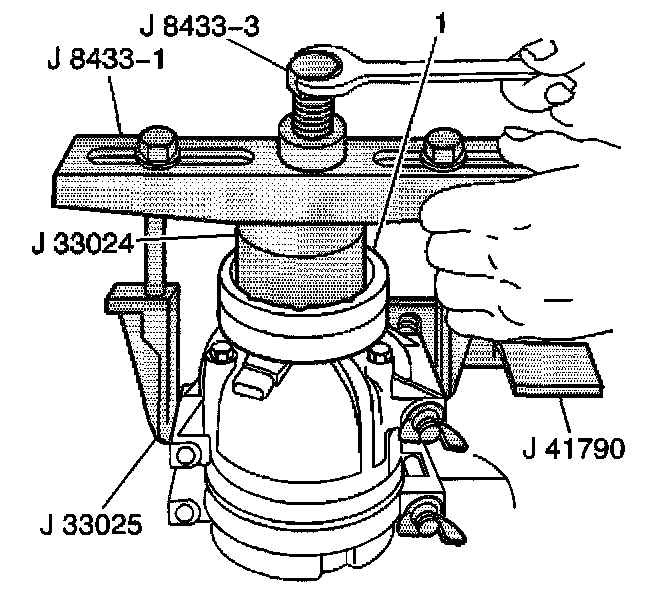 8. Install the J 8433 onto the compressor clutch coil (1) and tighten the puller leg bolts.