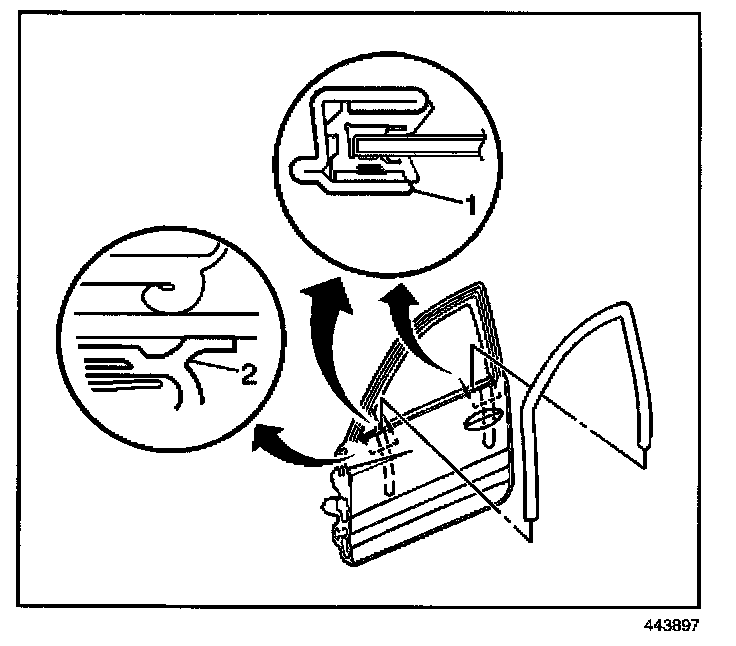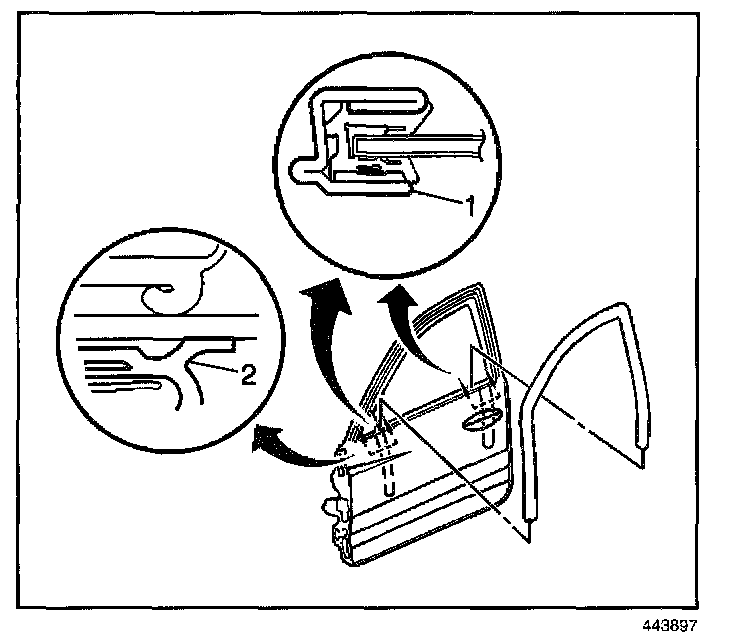 1.1. The window run channel outboard lip at the rearview mirror is rolled over or the glass run channel outboard lip at the B pillar is rolled over (2).