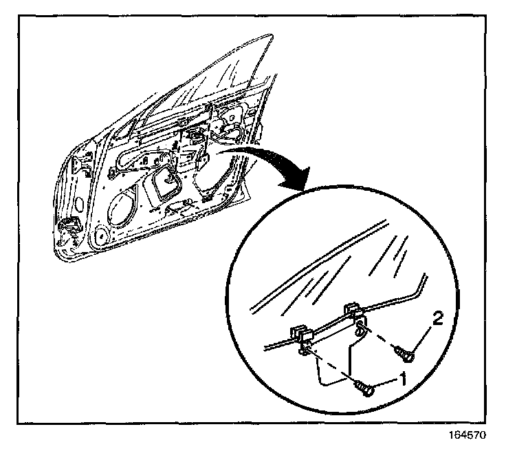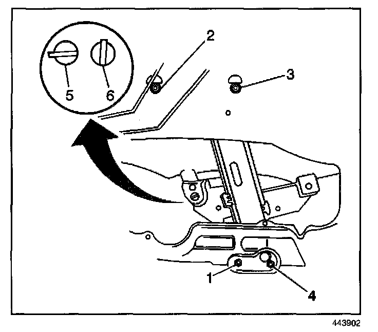 Rotate the cam (5) on the window regulator plate so that the slot (6) is straight up and down. In this position, the back of the window will tilt forward.