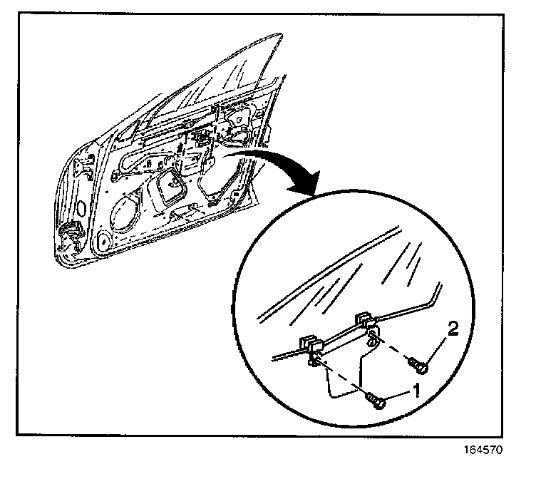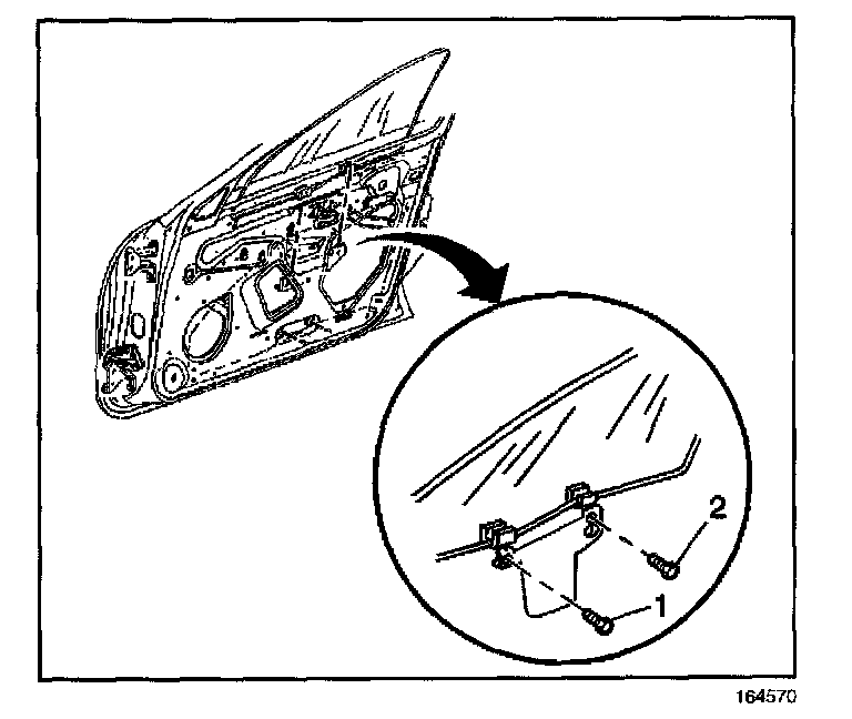 4. Remove the window to window regulator bolts (1,2).